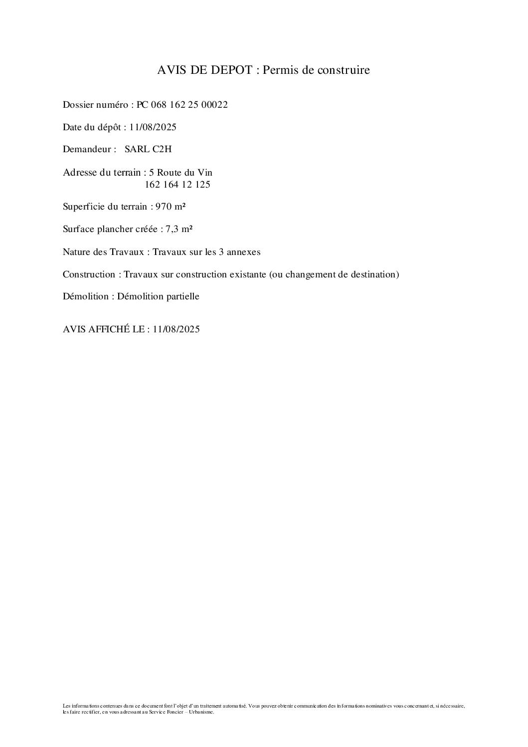 ki 5 route du vin PC0681622500022 11 08 2025 avis depot